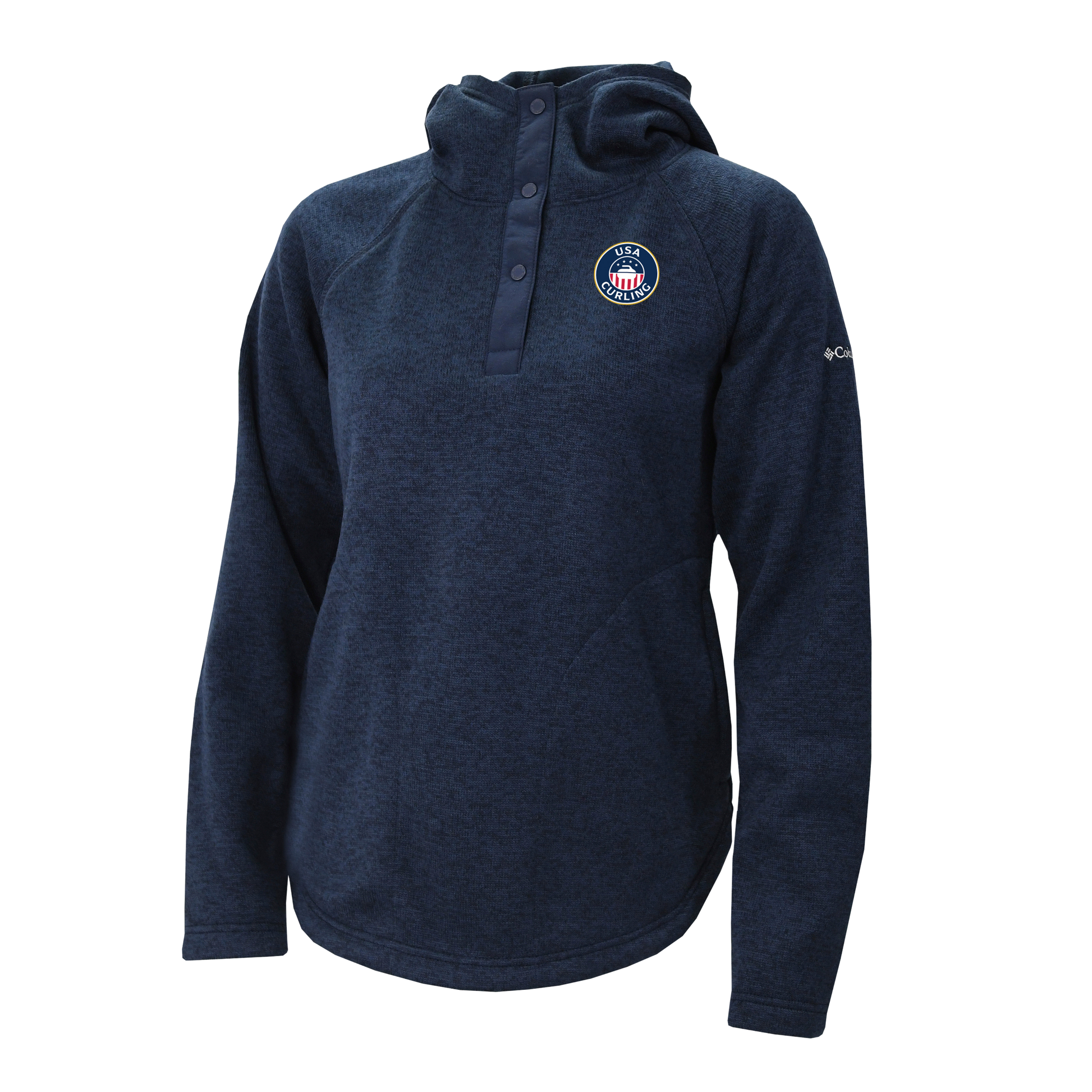 The Women's Columbia Sweater Weather Pullover Hoodie in collegiate navy features a three-button collar and an embroidered USA Curling logo. This thermal hoodie is perfect for layering, providing warmth and comfort in cold weather.